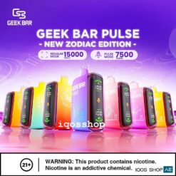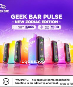 Geek Bar pulse new zodiac edition 15000 regular mode and pulse mode 7500 puffs disposable vape is now available in our online stock in Dubai-United Arab Emirates. Nicotine strength is 5%, dual mesh coil technology, pod capacity 16ml e-liquid and user friendly smart vape.